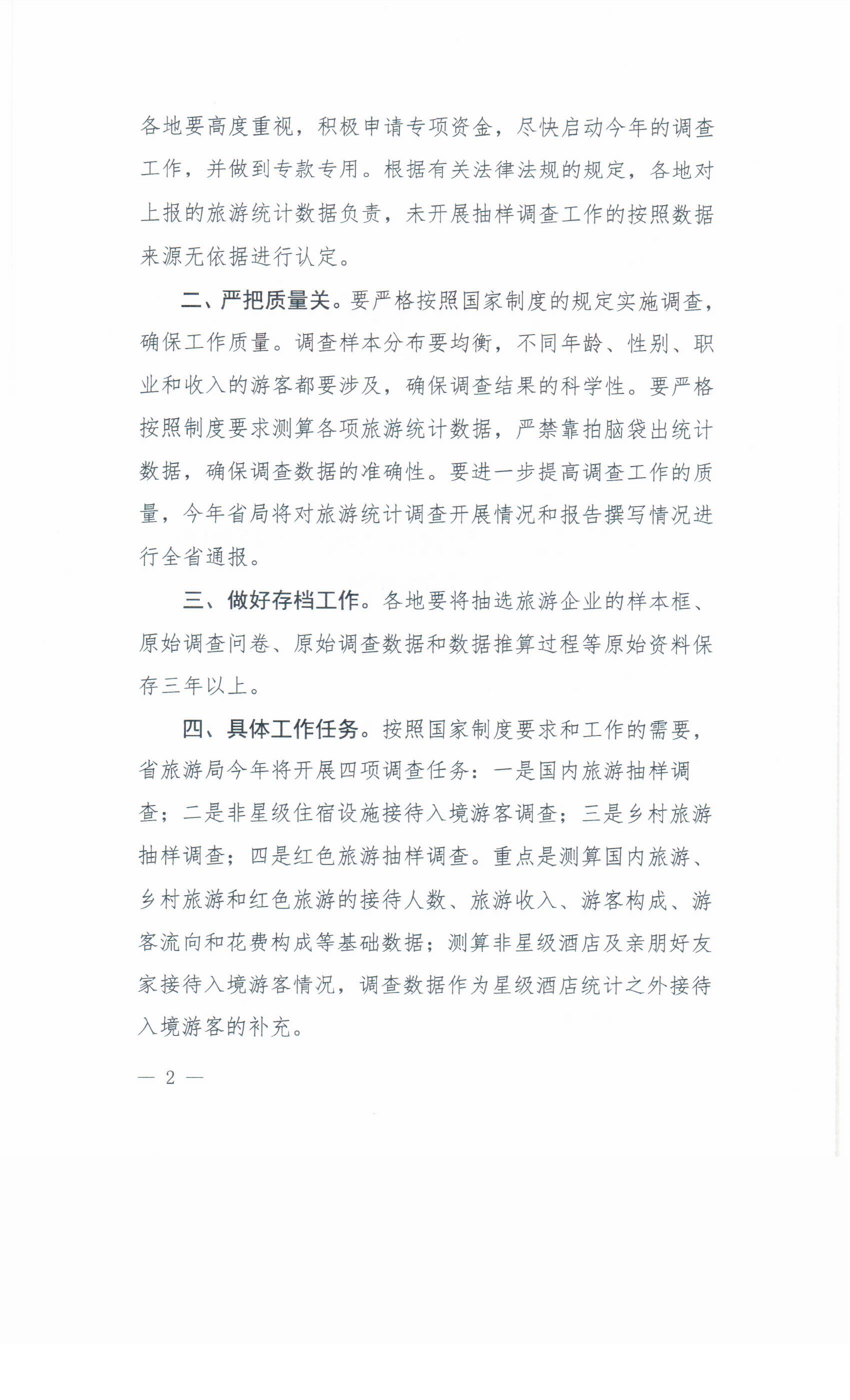 (四)具體工作任務(wù)。按照國(guó)家制度要求和工作的需要,省旅游局今年將開展四項(xiàng)調(diào)查任務(wù):一是國(guó)內(nèi)旅游抽樣調(diào)查;二是非星級(jí)住宿設(shè)施接待入境游客調(diào)查;三是鄉(xiāng)村旅游抽樣調(diào)查;四是紅色旅游抽樣調(diào)查。重點(diǎn)是測(cè)算國(guó)內(nèi)旅游、鄉(xiāng)村旅游和紅色旅游的接待人數(shù)、旅游收入、游客構(gòu)成、游客流向和花費(fèi)構(gòu)成等基礎(chǔ)數(shù)據(jù);測(cè)算非星級(jí)酒店及親朋好友家接待入境游客情況,調(diào)查數(shù)據(jù)作為星級(jí)酒店統(tǒng)計(jì)之外接待入境游客的補(bǔ)充。