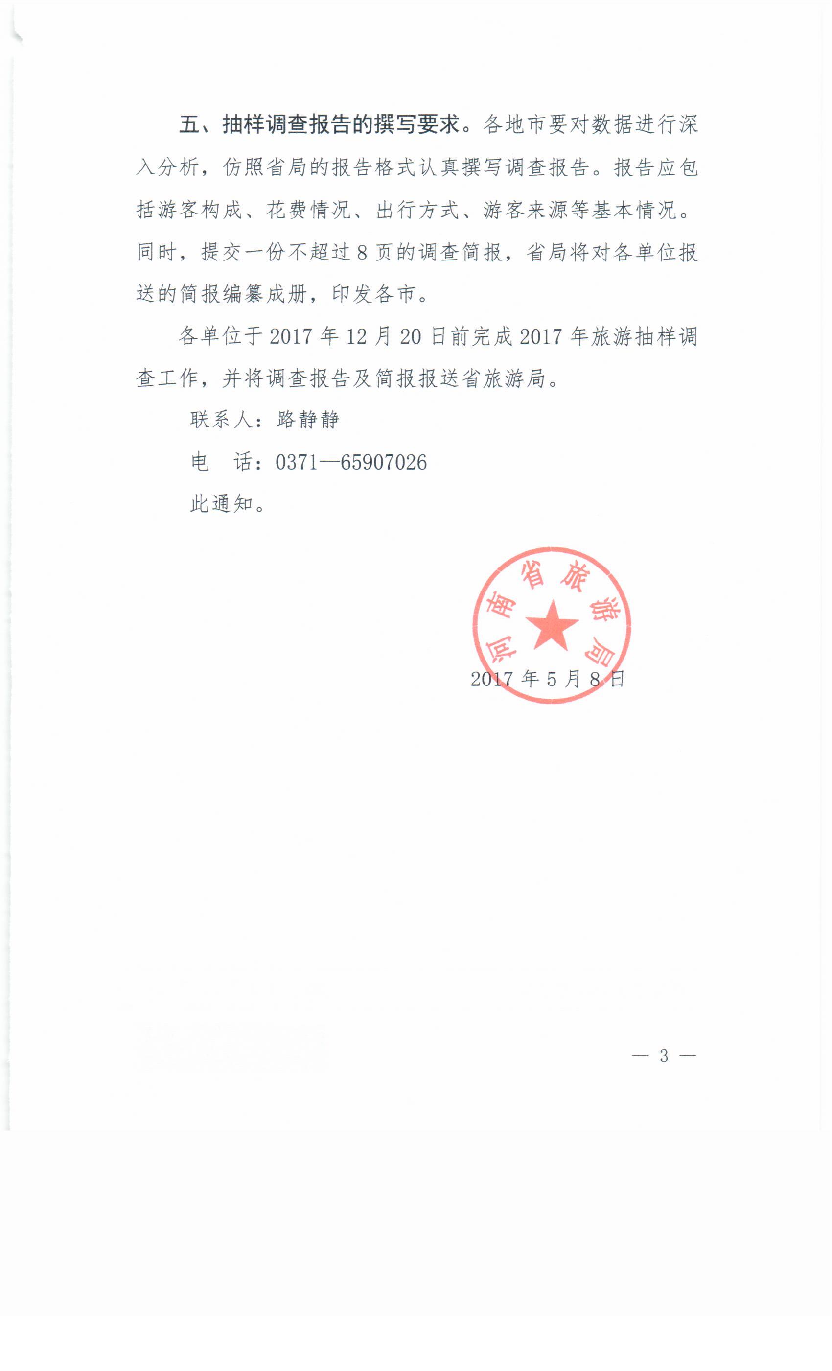 各單位于2017年12月20日前完成2017年旅游抽樣調(diào)查工作,并將調(diào)查報(bào)告及簡(jiǎn)報(bào)報(bào)送省旅游局。