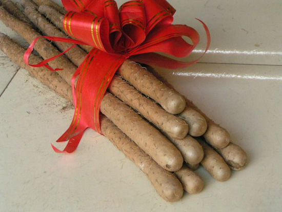 與普通懷山藥相比,鐵棍山藥有其獨(dú)特之處,可作為鑒別鐵棍山藥的依據(jù):鐵棍山藥粗細(xì)均勻,通常直徑1-2cm(如成年人拇指般),毛須略多,表皮顏色微深,并可見(jiàn)特有的暗紅色“銹斑”,粉性足,質(zhì)膩,折斷后橫截面呈白色或略顯牙黃色,體質(zhì)十分堅(jiān)重,入水久煮不散;由于含大量氨基酸,液汁較濃,味道鮮美,入口覺(jué)得“面而甜”,并伴隨淡淡的麻味。