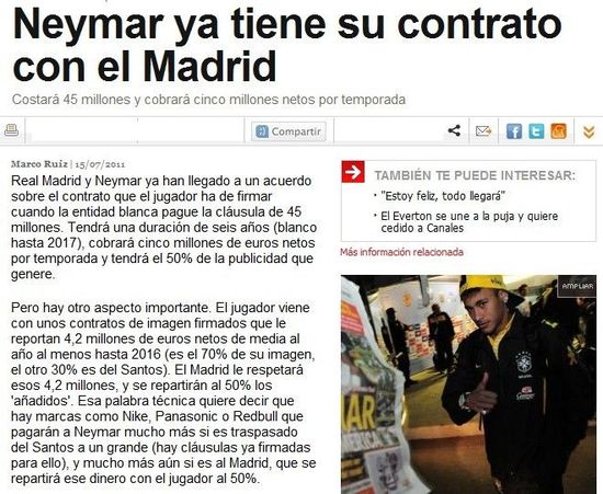 內(nèi)馬爾目前本就已與很多著名公司簽約(注:內(nèi)馬爾是耐克、松下等知名品牌的代言人),每年凈賺420萬(wàn)歐元,而一旦他能加盟皇馬,俱樂部必將盡全力提升其形象價(jià)值,同時(shí)亦會(huì)讓球員本人拿到廣告代言費(fèi)的50%。這也就是說,內(nèi)馬爾加盟皇馬的首個(gè)賽季至少也能賺得920萬(wàn)歐元,今后還有望水漲船高。