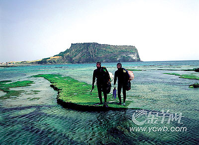 在濟(jì)州島海邊,你一定會(huì)看到海女們的身影,她們都有黝黑的皮膚,長發(fā)盤在頭頂,身穿黑色的緊身潛水衣,頭戴潛水鏡,背著色彩鮮艷的背囊,一個(gè)猛子扎進(jìn)海里……這些海女們常常發(fā)出口哨般的呼吸聲,僅靠一根繩子作為安全保障,徒手潛入20米深的海水中采獲海產(chǎn)品,一口氣往往憋足2分鐘。章魚、海膽、海蜇都是海女的獵物,但她們的主要目標(biāo)是鮑魚。由于危險(xiǎn)性太高,已經(jīng)很少有年輕人參與這個(gè)隊(duì)伍,濟(jì)州島的海女們都是年紀(jì)較大的婦女。