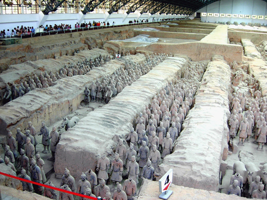 1974年以來,在陵園東1.5公里處發(fā)現(xiàn)從葬兵馬俑坑三處,出土陶俑8000件、戰(zhàn)車百乘以及數(shù)萬件實(shí)物兵器等文物;1980年又在陵園西側(cè)出土青銅鑄大型車馬2乘。引起全世界的震驚和關(guān)注,被譽(yù)為“世界第八奇跡”,F(xiàn)已在一、二、三號(hào)坑成立了秦始皇陵兵馬俑博物館,對(duì)外開放。