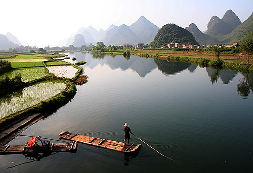 進入下游,河兩邊長滿了毛竹和各種樹木,一如鳳尾般地妖嬈,給清麗的遇龍河更添風韻。不同的是,上游兩岸非常空曠,展示著村野的原始。上下游分明是兩個世界。河水到下游已不如上游那么清澈,竹筏的前端還浮起了泡沫,可見已經(jīng)有污染存在了。