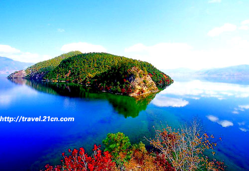 這時(shí)候見到的瀘沽湖,用一塊藍(lán)寶石來描述她一點(diǎn)也不過分。坐著豬槽船在湖面上蕩漾,手摸湖水,溫和而細(xì)膩,讓人感到透心的爽快。而湖底的水草一蕩一蕩的,叫人見了忍不住就想跳下去擁抱它們。放眼四周,醉人的女神山靜靜的看著我們。藍(lán)天,白云,綠山,紅山茶花,藍(lán)藍(lán)的水,花一樣的摩梭姑娘,英俊的摩梭小伙子,再聽著沁人心脾的山歌,如果可以一直坐在船上,我永遠(yuǎn)也不想起來了。
