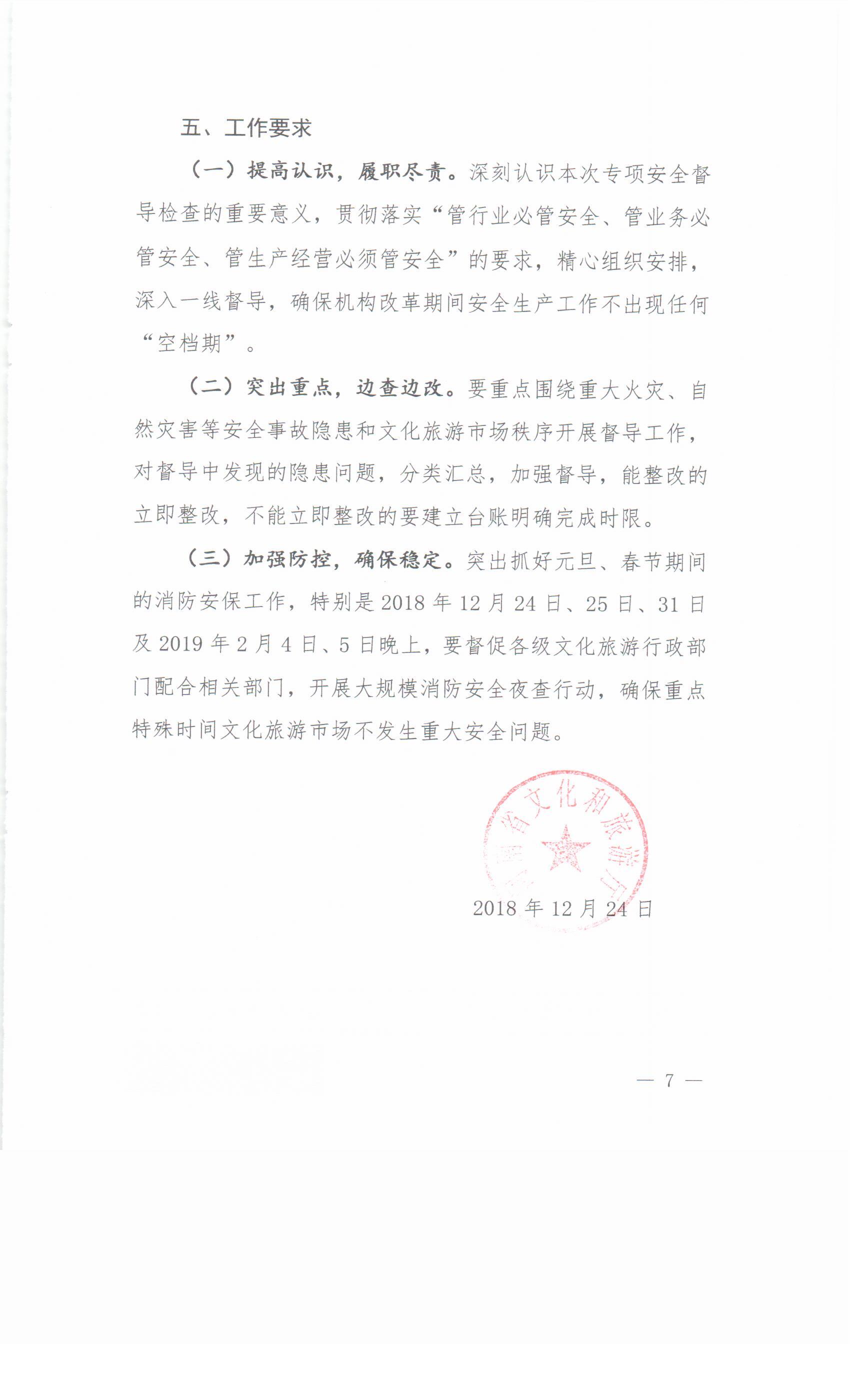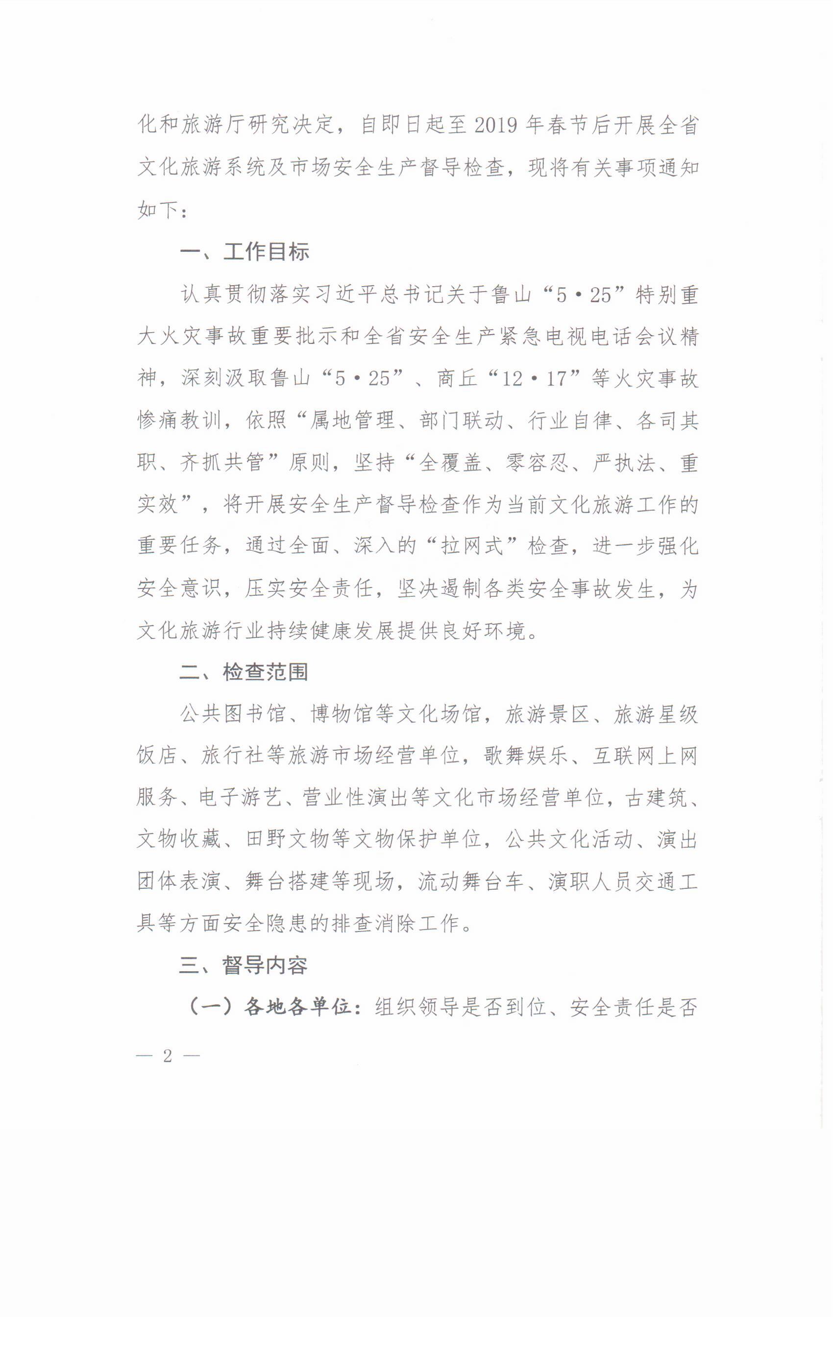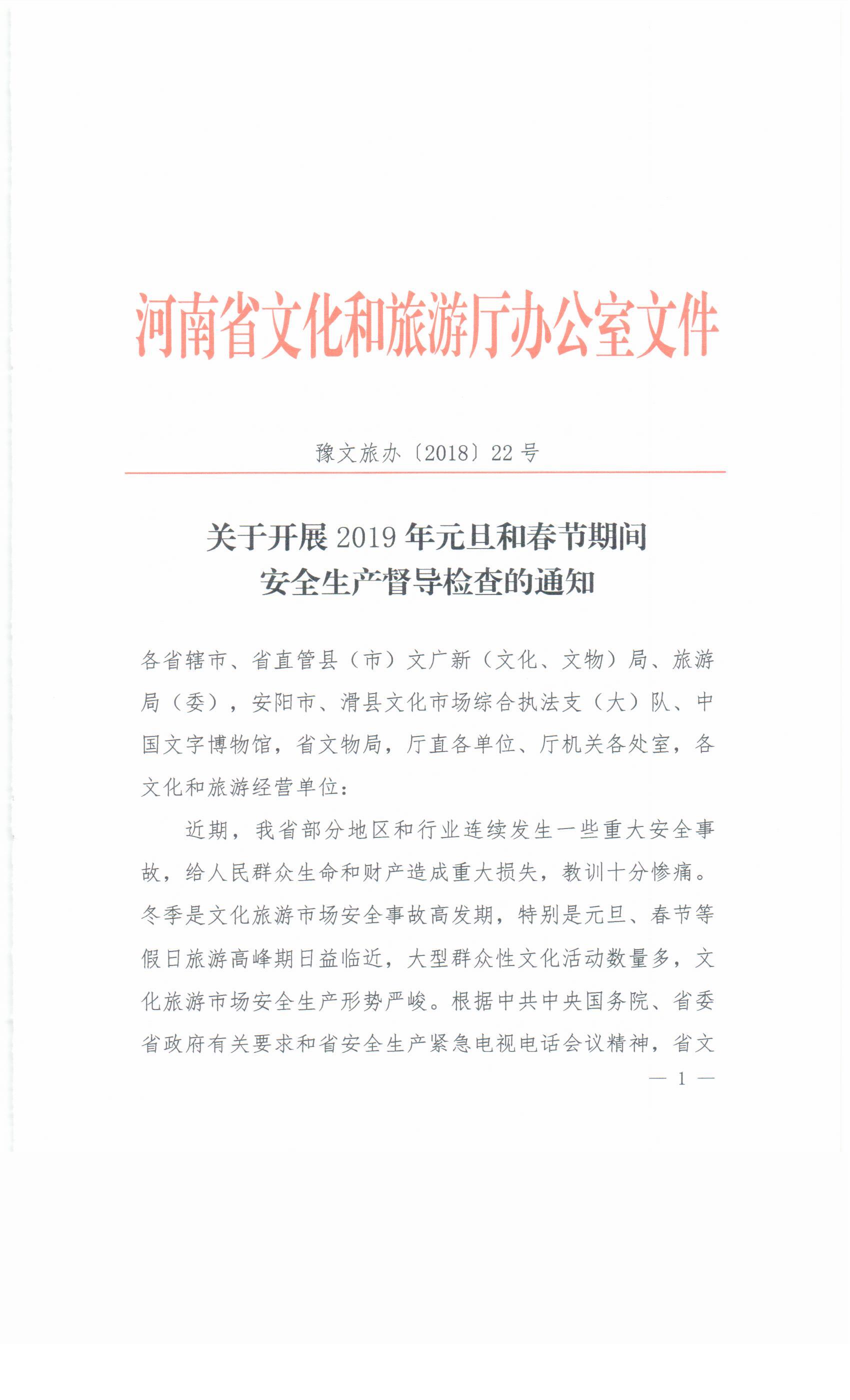 河南省文化和旅游廳關(guān)于開(kāi)展2019年元旦和春節(jié)期間安全生產(chǎn)督導(dǎo)檢查的通知