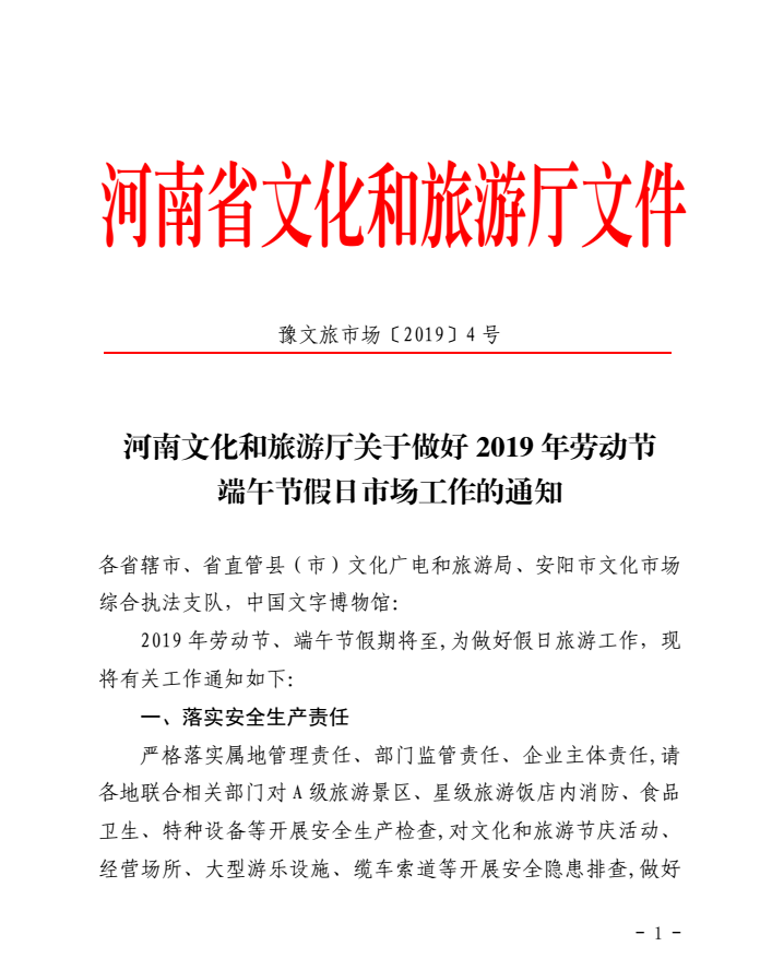 河南文化和旅游廳關(guān)于做好2019年勞動節(jié)端午節(jié)假日市場工作的通知