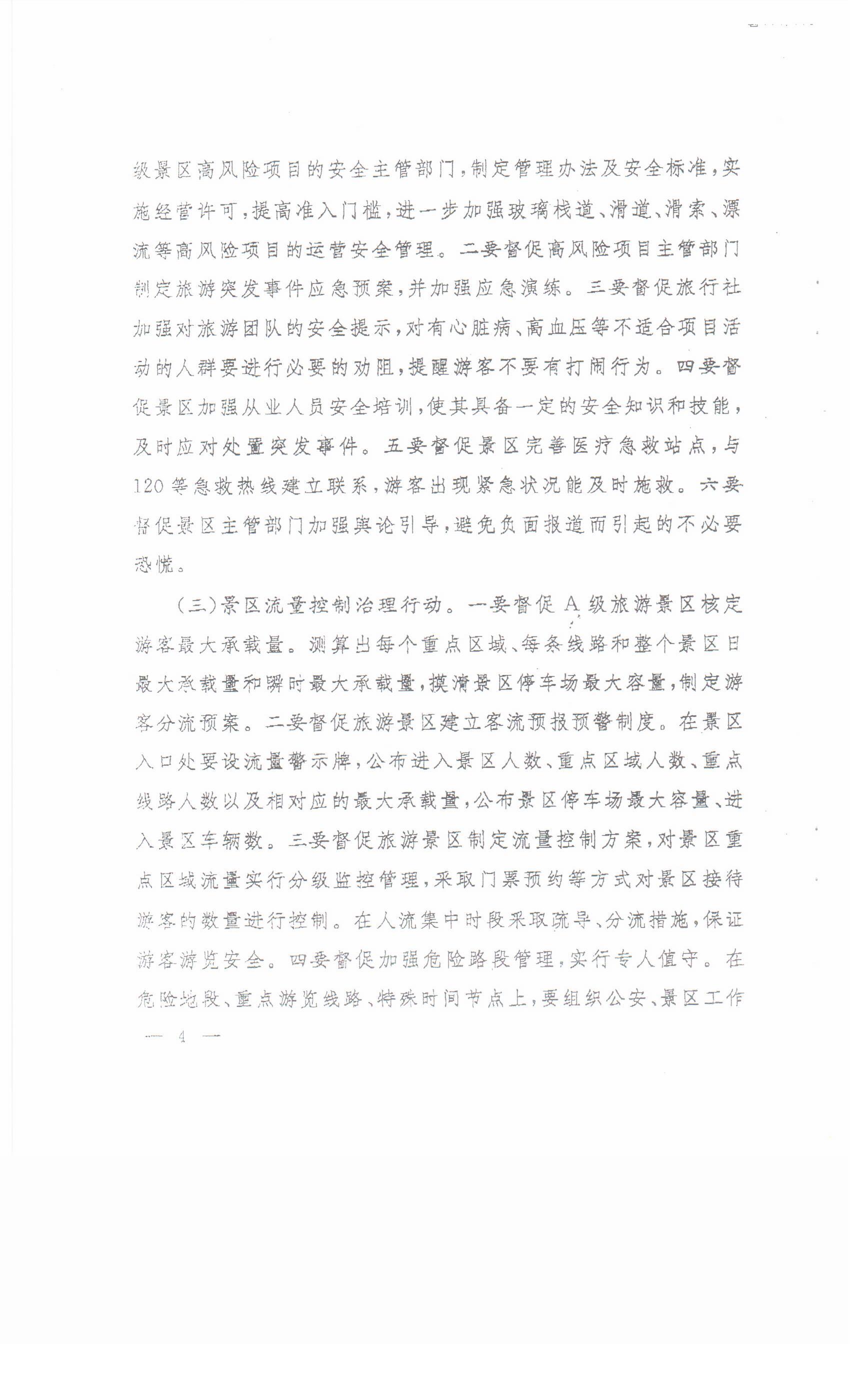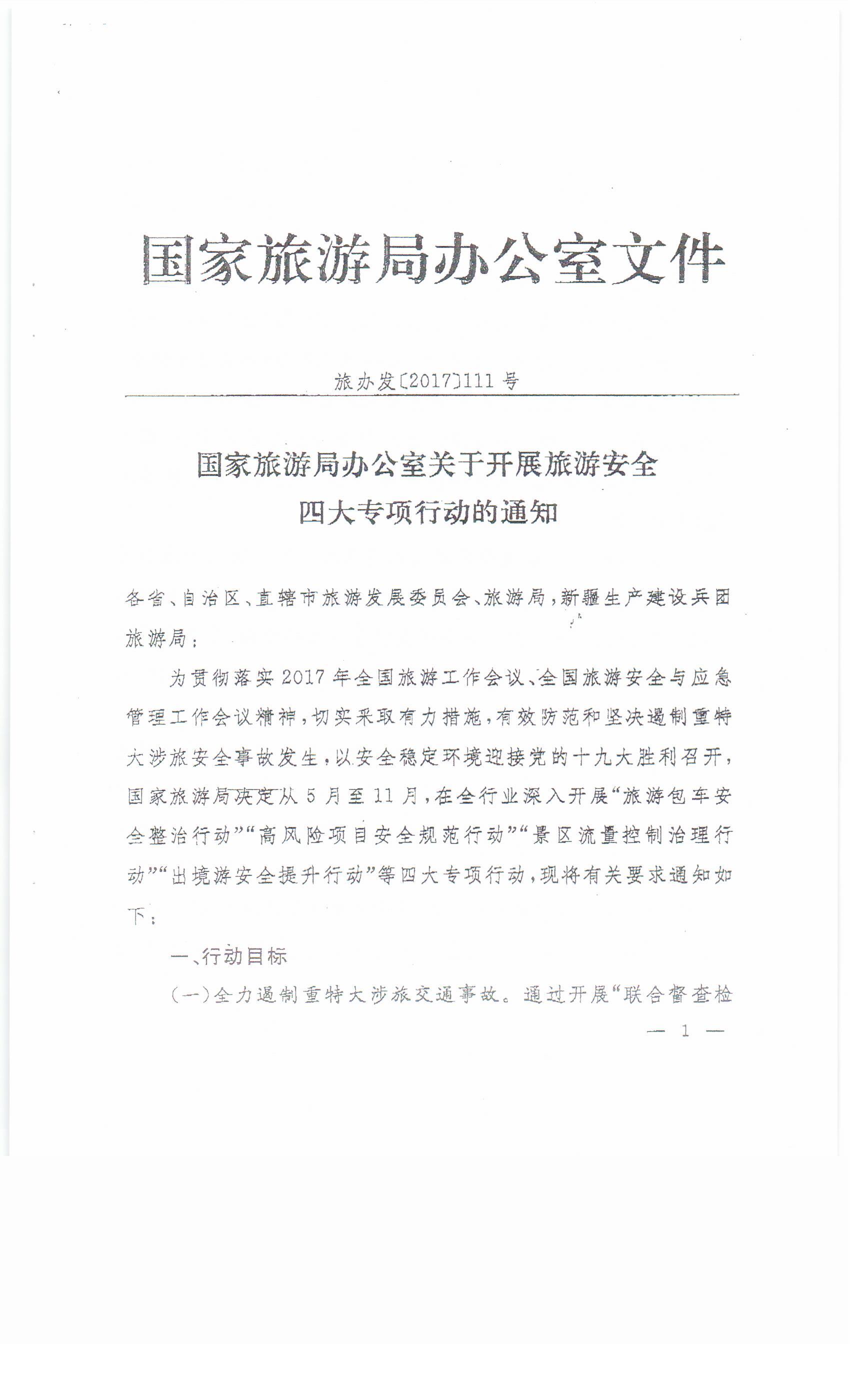 現(xiàn)將國家旅游局辦公室《關(guān)于開展旅游安全四大專項(xiàng)行動(dòng)的通知》轉(zhuǎn)發(fā)你們。請按照通知要求,加強(qiáng)組織領(lǐng)導(dǎo),注重協(xié)調(diào)配合,強(qiáng)化督導(dǎo)檢查,確保專項(xiàng)行動(dòng)取得實(shí)效,為廣大游客創(chuàng)造一個(gè)安全、文明、有序的旅游環(huán)境。