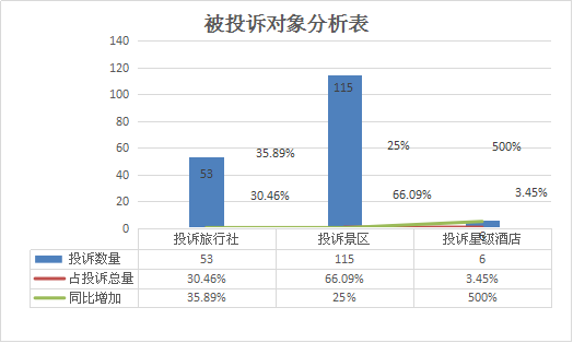 從投訴總量看,第二季度投訴174件,比去年同期增加38件,同比增加27.94%。從被投訴對象看,投訴旅行社53件,占投訴總量的30.46%,同比增加35.89%;投訴景區(qū)115件,占投訴總量的66.09%,同比增加25%;投訴星級酒店6件,占投訴總量的3.45%;同比增加500%。