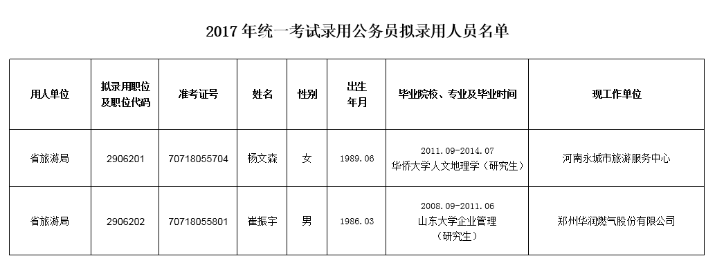 河南省旅游局2017年統(tǒng)一考試擬錄用公務員公示