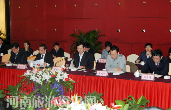 11月3日下午,調研組在鄭州舉行座談會,詳細了解河南省旅游業(yè)發(fā)展狀況,并就如何全面貫徹落實科學發(fā)展觀,推動中國旅游業(yè)全面、協(xié)調、可持續(xù)發(fā)展進行探討。河南省政府副省長宋璇濤,省政府副秘書長寇武江,省旅游局副局長李亞白、紀檢組長周保健、副局長張鳳有,以及省內部分旅游企業(yè)負責人參加了座談會。