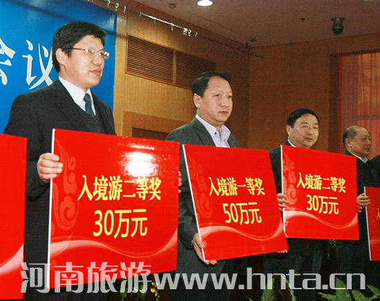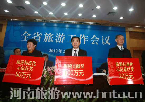 2012年全省旅游工作會議于14日上午在鄭州召開。會上分別對青天河風(fēng)景區(qū)、河南旅游集團(tuán)、德國漢堡中國之旅有限公司、香港旅游業(yè)發(fā)展局、淮陽縣等在創(chuàng)建國家5A景區(qū)、組織入境游、旅游標(biāo)準(zhǔn)化建設(shè)等方面做出突出成績的多家單位,以及焦作云臺山國家風(fēng)景名勝區(qū)管理局所做財稅貢獻(xiàn)進(jìn)行了表彰獎勵,獎勵總金額達(dá)到1000萬元。