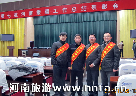 2013年12月29日,河南省旅游援疆前方工作隊(duì)全體同志在新疆哈密地區(qū)表彰會(huì)現(xiàn)場。左一為鶴壁市援疆干部、哈密地區(qū)哈密市旅游局副局長何海林,左二為商丘市旅游局援疆干部、哈密地區(qū)巴里坤縣旅游局副局長姖艷峰,右一為濮陽市旅游局援疆干部、哈密地區(qū)伊吾縣旅游局副局長趙永強(qiáng),右二為河南省旅游局援疆干部、河南旅游援疆前方總領(lǐng)隊(duì)、哈密地區(qū)旅游局副局長郭繼山