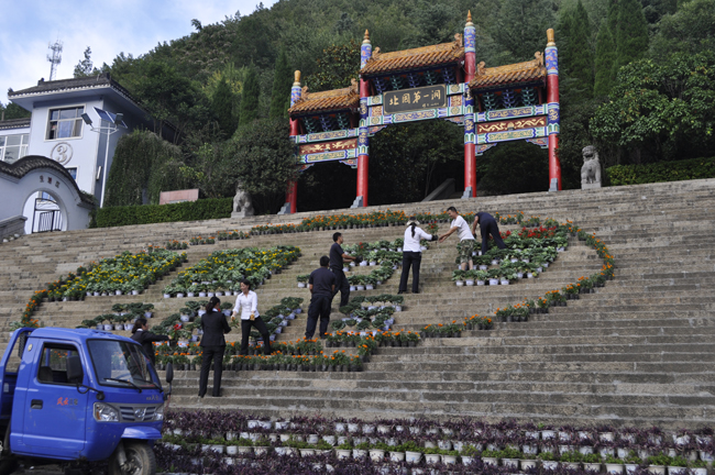 三.美化旅游環(huán)境。園林部將提前培育好的25000盆60多個(gè)品種的鮮花,抽調(diào)人員頂著日曬雨淋,加班加點(diǎn)的在景區(qū)大門口、停車場、牌樓前、辦公樓前等各個(gè)角落進(jìn)行擺放,目前,已擺放完畢,展現(xiàn)在游客面前的是清新亮麗的旅游環(huán)境。