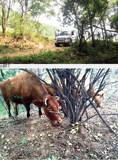 沒有現(xiàn)成的登山路,大家沿著牛蹄踏出來的蹄印慢慢往山上走。一路上,黃的山桃、紅的山棗,還有各種不知名的山果不時(shí)出現(xiàn)在我們眼前。腳下雖累,但大家的臉上滿是興奮的神情。據(jù)盤城村村委會主任介紹,以前還有村民住在熊耳山腳下,現(xiàn)在都搬走了,山下的窯洞已經(jīng)多年無人居住,只有護(hù)林工人時(shí)常來山里轉(zhuǎn)轉(zhuǎn)。山里野果多,水草好,村民就在黃牛的脖子上掛上鈴鐺,將其散養(yǎng)在山中。山上的野果是牛兒鐘愛的美食,成熟后自然脫落,牛兒自行食用,也無需人員看護(hù)。果然走到半山腰,我們循著鈴鐺聲看到了幾頭正悠閑吃果子的黃牛。