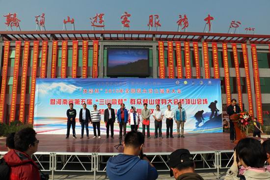 金秋的轎頂山層林盡染,五彩紛呈,正是登高望遠的最佳時節(jié)。為大力推進文明河南建設(shè),推動體育與旅游融合發(fā)展,推動群眾文明旅游、體育健身活動的深入開展,進一步營造“做文明人、辦文明事”的良好氛圍,引導廣大人民群眾積極參加戶外活動,形成崇尚健康、參與健身、追求健康文明生活方式的良好環(huán)境和氛圍,由國家體育總局登山運動管理中心、中國登山協(xié)會、河南省體育局、河南省文明辦和河南省旅游局聯(lián)合主辦,河南省社會體育管理中心、河南省旅游局信息中心、河南省登山戶外運動協(xié)會、新鄉(xiāng)市體育局、新鄉(xiāng)市旅游局、輝縣市人民政府共同承辦,輝縣市體育局、輝縣市旅游局、輝縣市轎頂山景區(qū)、河南旅游資訊網(wǎng)、河南戶外聯(lián)盟、河南戶外網(wǎng)聯(lián)合協(xié)辦的2015年全國群眾登山健身大會暨河南省第五屆“三山同登”群眾登山健身大會轎頂山會場活動于10月17日上午在轎頂山隆重舉行。轎頂山文化周活動同時隆重啟動。省旅游局、省體育局、省社體中心、省旅游局信息中心、省登山協(xié)會、河南戶外聯(lián)盟以及新鄉(xiāng)市、輝縣市等相關(guān)單位的嘉賓出席了啟動儀式。 本次群眾登山健身活動暨轎頂山文化周是河南省第五屆“三山同登”群眾登山健身大會系列活動之一,活動緊緊圍繞著“把旅游業(yè)打造成為國民經(jīng)濟戰(zhàn)略性支柱產(chǎn)業(yè)和人民群眾更加滿意的現(xiàn)代服務(wù)業(yè)”的主題,以促進體育與旅游在更大范圍內(nèi)、更廣領(lǐng)域里、更高層次上得到拓展和深化為主旨,使體育旅游的發(fā)展成果匯集更多人,同時為中原經(jīng)濟區(qū)的建設(shè)注入新的活力。 開幕式由新鄉(xiāng)市旅游副局長李紅兵主持,轎頂山景區(qū)董事長趙平生介紹了景區(qū)基本情況,輝縣市政府副市長崔滿元致歡迎辭,河南省社會體育管理中心書記劉保祥宣布活動啟動。