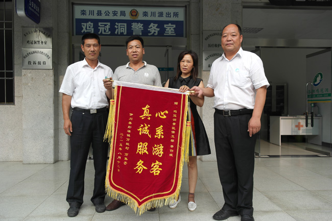 “真誠服務(wù)、情系游客”這是8月12日下午4時來自洛陽市伊川縣彭婆鎮(zhèn)萬坡村的萬集吾老人的家屬送給雞冠洞景區(qū)錦旗上的話語。