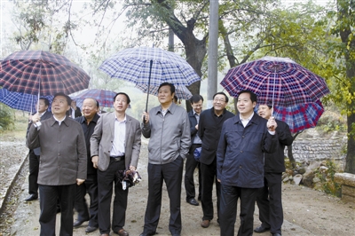 11月1日上午,副省長(zhǎng)趙建才(右二)在信陽(yáng)市委書記郭瑞民(右一)的陪同下前往平橋區(qū)郝堂村實(shí)地調(diào)研美麗鄉(xiāng)村建設(shè)中的生態(tài)環(huán)境保護(hù)工作。在認(rèn)真考察了該村的道路、綠化景觀、基礎(chǔ)設(shè)施,仔細(xì)參觀了舊居改造成的農(nóng)家樂、污水處理系統(tǒng)后,趙建才對(duì)郝堂村注重原生態(tài)建設(shè),堅(jiān)持用最自然、最環(huán)保的方式來(lái)建設(shè)美麗村莊的做法給予充分肯定。副市長(zhǎng)張富治陪同調(diào)研。