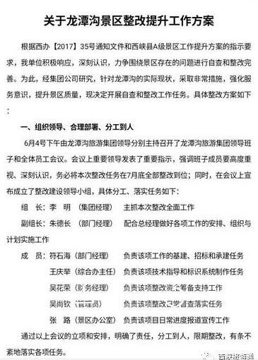 龍?zhí)稖希悍e極貫徹落實(shí)全縣A級(jí)景區(qū)整改提升工作動(dòng)員會(huì)精神,組織景區(qū)全體工作人員召開(kāi)專(zhuān)題會(huì),安排部署整改工作,對(duì)景區(qū)進(jìn)行全方位的拉網(wǎng)式排查,發(fā)現(xiàn)問(wèn)題,記錄在案,采取措施,積極整改。一手抓硬件設(shè)施整改,一手抓服務(wù)意識(shí)提升,著力提升員工素養(yǎng),為游客提供家人化服務(wù),打造家庭式環(huán)境。一是成立了整改建設(shè)領(lǐng)導(dǎo)小組,保證各項(xiàng)工作有分工,有責(zé)任人。二是景區(qū)標(biāo)識(shí)標(biāo)牌重建的工作已經(jīng)完成設(shè)計(jì),進(jìn)入招標(biāo)階段;三是星級(jí)公廁改造在緊鑼密鼓的進(jìn)行中,第一座AAA級(jí)公廁主體工程已經(jīng)完工,第二座AAA級(jí)公廁地基已經(jīng)平整好。