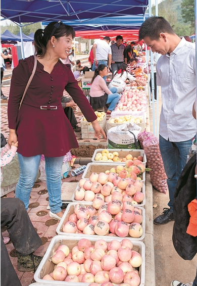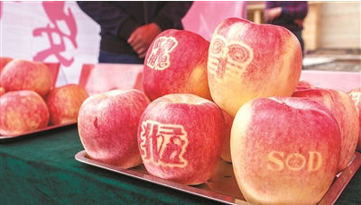 尤其奪人眼球的是種類(lèi)繁多的蘋(píng)果,它們大小不一,有的遍體通紅,在陽(yáng)光下閃閃發(fā)光;有的紅黃相間,十分飽滿(mǎn),除了人盡皆知的“紅富士”“嘎啦”,還有“錦繡紅”“蜜脆”等近年來(lái)新培育的品種。
