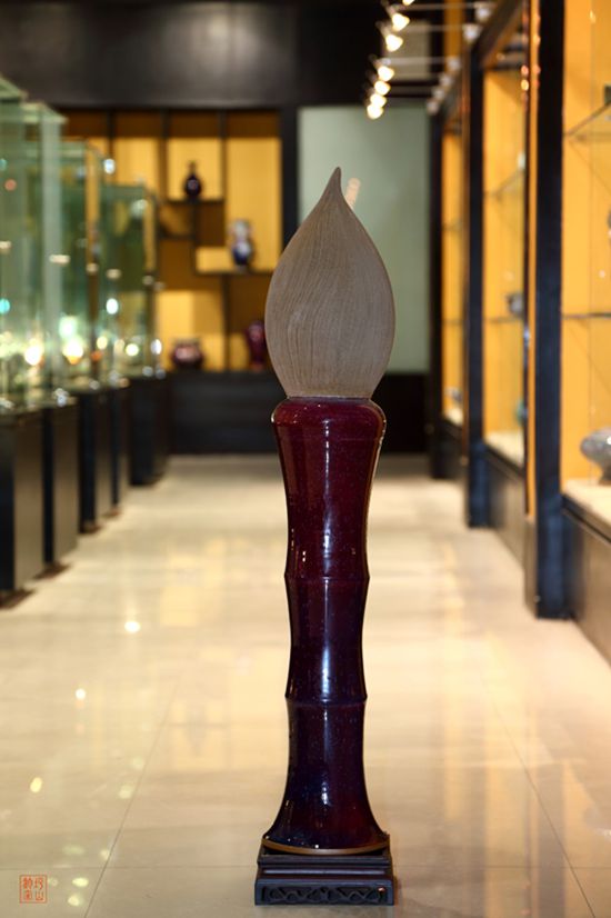 這種變,體現(xiàn)在對文化的固守上。劉中玄突出抽象藝術(shù)和寫實(shí)手法的巧妙結(jié)合,以《詩經(jīng)》中的“關(guān)關(guān)睢鳩,在河之州”句為靈感,創(chuàng)作出手拉坯為主、泥塑為輔的《荷之洲》作品;以傳統(tǒng)書畫文化為創(chuàng)想,制作出高達(dá)1.16米的鈞瓷《大毛筆》和“梅、蘭、竹、菊”“春、夏、秋、冬”大型畫筒畫缸系列;以佛教文化為主旨,制作改良了《四大菩薩》和觀音、彌勒佛像系列;順應(yīng)天道人心,研發(fā)制作出以“清廉”為主題的蓮花明月系列作品;以“和合”文化為核心,制作出了《和平尊》《如意尊》《永和尊》系列作品,三件作品互為輔承,一脈同源;以柔美婉約的江南文化為特點(diǎn),制作出《唐風(fēng)》《錦翠》《江南》等一系列唯美風(fēng)格鈞瓷作品……等等,整體風(fēng)格突變,令人眼前一新。
