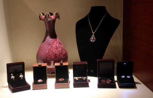 鈞瓷首飾作為中國鈞瓷的一種全新的藝術(shù)表現(xiàn)形式,通過鈞瓷“天珠”與黃金、白銀、鉆石等完美鑲嵌,以鈞瓷“天珠”和瓷片為主石,巧奪天工、匠心獨(dú)運(yùn)的展現(xiàn)鈞瓷釉色變化之美。其作品溫潤、剔透、晶瑩、多變,兼有寶石、翡翠、琥珀等多種珠寶材料的藝術(shù)特點(diǎn),每款鈞瓷天珠都根據(jù)不同的窯變紋路和意境,設(shè)計(jì)不同的珠寶款式,絕不重復(fù)雷同,具有極高的觀賞效果和收藏價(jià)值,在今年5月初全國工藝美術(shù)大賽中榮獲銀獎(jiǎng)。同時(shí),坪山鈞窯燒制的鈞瓷茶具、傳統(tǒng)鈞瓷產(chǎn)品,也被選定為指定禮品用于駐外機(jī)構(gòu)供應(yīng)。