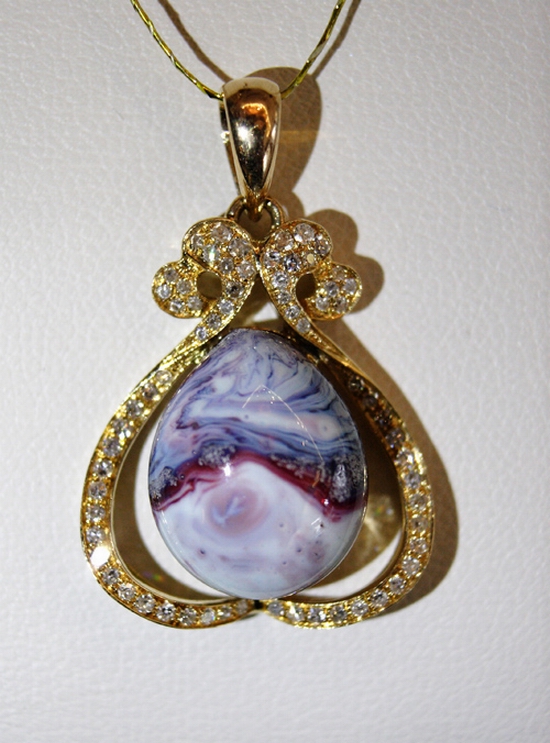 禹州坪山鈞窯有限公司選送的產(chǎn)品鈞瓷吊墜,是坪山鈞窯獨家推出的專利作品,是鈞瓷文化和珠寶藝術(shù)的完美結(jié)合。以鈞瓷“天珠”為主材料,配以黃金、白銀和鉆石,采用珠寶加工工藝勾勒線條,和鈞瓷天珠完美鑲嵌,盡顯高貴典雅和新潮時尚。此件參賽作品設計精練,巧奪天工,作品主石鈞瓷天珠上呈現(xiàn)出拉絲紅、水紋藍等典型鈞瓷釉色特點,似琥珀天然融動,又像寶石流光溢彩,與黃金、鉆石光芒交相輝映,散發(fā)出獨特的工藝美感和藝術(shù)魅力,羸得了各屆專家和現(xiàn)場觀眾的一致贊譽。這也再次證明了鈞瓷首飾產(chǎn)品本身所具有的獨創(chuàng)性、文化性和前瞻性,也體現(xiàn)了業(yè)內(nèi)專家和市場對鈞瓷首飾的認可和肯定,對于鈞瓷首飾以及其他鈞瓷衍生產(chǎn)業(yè)的發(fā)展,具有非常重要的意義。