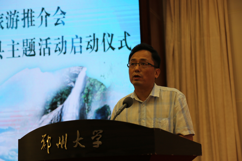 領(lǐng)略湖光山色,傳承中原文明。鄭州大學(xué)副校長關(guān)紹康教授發(fā)表了熱情洋溢的致辭,介紹了鄭州大學(xué)包容寬厚、奮發(fā)進(jìn)取的歷史、“篤信仁厚、慎思勤勉”的校風(fēng),他講到,嵩縣山高水長、歷史悠久、人文厚重,生態(tài)資源得天獨(dú)厚,對鄭州大學(xué)旅游管理學(xué)院與嵩縣白云山景區(qū)簽署“實(shí)踐教研基地”戰(zhàn)略合作協(xié)議表示祝賀。