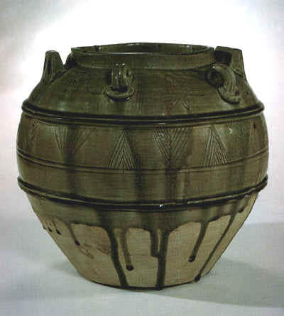 名稱:青釉刻花六系瓷罐 規(guī)格:高28.5厘米 口徑18.5厘米 年代:北齊武平七年(公元576年) 出土?xí)r間:1958年 出土地:河南省濮陽縣李云墓出土 肩附六系(兩橫系四豎系),系之間以圓規(guī)刻劃圓圈、花瓣紋。腹部刻有三周弦紋帶和鴨、樹及斜線三角紋。此罐胎質(zhì)堅(jiān)硬,內(nèi)外施釉,內(nèi)滿釉外半釉,釉質(zhì)清澈明亮。