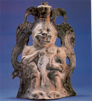 陶壺壺頭為蒜頭狀,壺體正面高浮雕一呈坐姿的怪獸。怪獸面部肥胖,兩眼凸起,鼻子高大,嘴大張露出四齒,脖子短粗。身呈人體狀,著衣捋袖,褲腿亦捋至膝蓋。手腳均為鷹爪。雙手抱一魚。壺兩側(cè)上下各塑二鳥,鳥首相背,長(zhǎng)尾下垂與下部鳥首相接。通體用紅、白、淺藍(lán)彩繪。壺身背面平坦,原有彩繪現(xiàn)已脫落。雙鳥怪獸彩繪陶壺造型別致,浮雕畫面形象生動(dòng),帶有濃厚的宗教迷信色彩,這種形象可能與遠(yuǎn)古神話傳說有關(guān)。