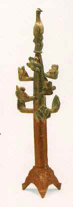 名稱:紅綠釉桃都樹 規(guī)格:高63厘米 年代:西漢(公元前206-公元24年) 出土?xí)r間:1969年 出土地:河南省濟源市泗澗溝 現(xiàn)藏地:河南省博物院 紅陶胎,通體飾紅綠釉。全器由桃都山形樹座、樹干、樹枝三部分組合而成,樹干頂端有蹲熊、天雞,周匝長三層樹枝,枝叉上攀附猿猴、棲息烏鴉,樹座表面塑有裸體人、羽人、奔獐、飛蟬等。
