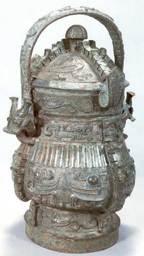 是商代的宮廷器具,口與蓋子母扣合,鼓腹,圈足。蓋上有菌狀鈕,蓋及器身出扉棱四條。整個器物以云雷紋為地,飾夔紋或鳥紋。上腹部有豎瓦紋,提梁兩端飾獸頭。蓋內(nèi)及器底均鑄 “祖辛” 二字銘文。