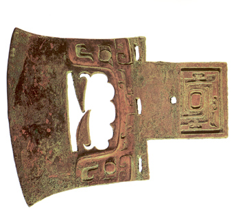 名稱:饕餮紋鉞 規(guī)格:通長17厘米,寬15厘米 時代:商代(約公前17世紀-前11世紀) 出土?xí)r間:1954年 出土地:河南省鄭州市人民公園 商代青銅器。鉞前有弧形刀,兩角外侈,身內(nèi)縮,平肩,內(nèi)扁寬,肩下兩側(cè)各有一長條形穿。鉞中部鑄一饕餮,雙耳外聳,圓目突起,鏤空的大嘴中獸牙交錯,甚為獰厲。