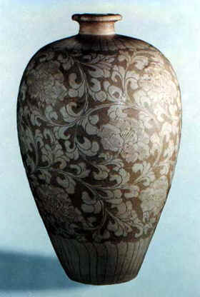名稱:白釉剔花梅瓶 規(guī)格:高34、口徑6、腹圍65厘米 時代:北宋(公元961年-1134年) 出土地:河南省湯陰縣 現(xiàn)藏地:河南博物院 體略呈橄欖形,腹部飾剔花纏枝牡丹紋,肩部與腹下部刻菊瓣紋,顯得雍容華貴;y處施白釉,余皆露褐色胎質(zhì)。所謂剔花,乃是將花紋以外的地子剔掉,使得花紋裝飾更為醒目,常見有白釉剔花和醬釉剔花兩種。在宋代磁州窯系中,以河南修武當陽峪窯的剔花工藝最為精湛。