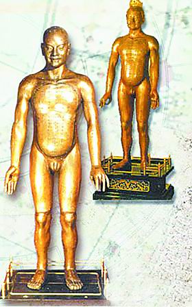 王惟一主持設(shè)計(jì)鑄造的針灸銅人,是兩座身高如同常人的裸體男像,系用精銅雕鑄而成,其工藝設(shè)計(jì)可謂精巧無比,在以后的各個(gè)朝代里,一直被人們視為“國寶”。在醫(yī)學(xué)史上,針灸銅人更是世界上最早創(chuàng)制的人體經(jīng)脈、經(jīng)穴模型,也是世界上最早的一種如實(shí)反映人體內(nèi)臟和骨骼的解剖模型。但是,宋代針灸銅人自鑄成之后,卻命運(yùn)坎坷,歷經(jīng)滄桑,在封建朝代的相互更替和戰(zhàn)火混亂之中最后都下落不明。