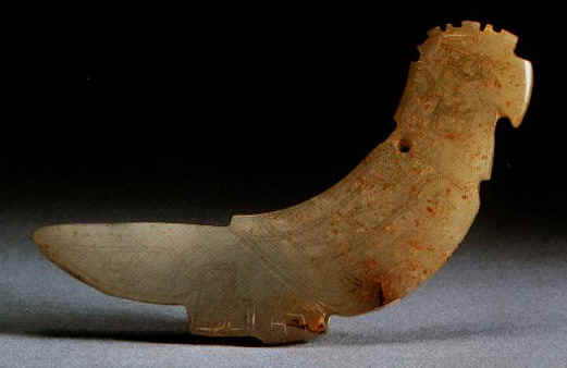 名稱(chēng):青玉鳥(niǎo)形佩 規(guī)格:長(zhǎng)10厘米,寬2.5厘米 時(shí)代:商代晚期 出土?xí)r間:1976年 出土地:安陽(yáng)殷墟婦好墓 現(xiàn)藏地:河南省博物院 此佩屬青玉質(zhì),體呈伏狀,帶冠短翅,尖喙圓眸,翹尾屈足,仿佛即將飛起。頸部的孔可供佩系。玉佩采用雙面雙線(xiàn)勾勒,具有典型的商玉風(fēng)格。