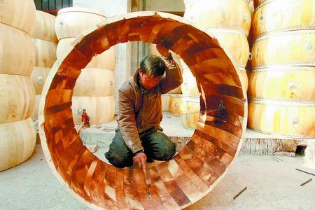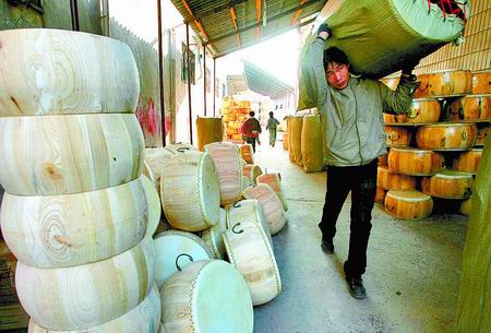一批南方用的大鼓做好了,村里人開始裝車起運(yùn)。這種鼓外立面不上漆,露出木紋。