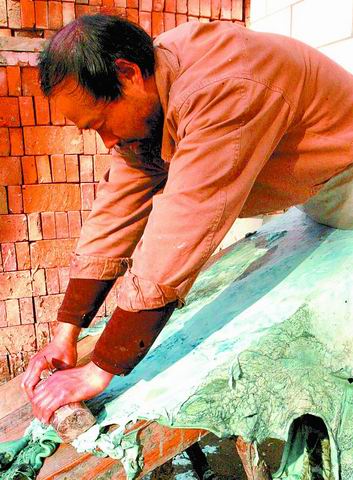 制作鼓皮的第一道工序:用刨子將牛皮上面的脂肪刮掉,只要最外面的一層皮子。