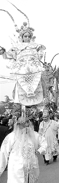 嵩山鬧歌的表演形式很特別——把孩子作為道具頂在大人頭上進(jìn)行表演。由于大人和小孩一般扮演的都是古裝戲曲人物,所以獨特的穿著和化裝很吸引人眼球。