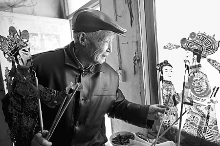 岳義成今年80歲,是最年長(zhǎng)的皮影大師。