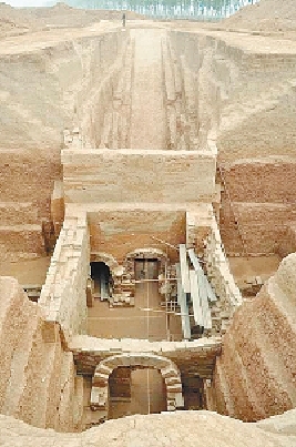 該墓葬位于邙山陵墓群大漢冢東漢帝陵陵園的東側,即洛陽市孟津縣送莊鄉(xiāng)三十里鋪村東南。墓葬形制為東西向、長斜坡墓道、磚券多室墓,由墓道、甬道、耳室、前室、后室、北側室、南雙側室等部分組成。墓葬東西長50.6米、南北寬21.1米、深10.5米,構筑方法為明券。墓磚可分為條形磚和楔形磚兩種,最大的墓磚長度達46厘米、厚10厘米、重50公斤,可見墓葬規(guī)格之高。在楔形磚上發(fā)現(xiàn)朱書“左”、“右”、“第一”、“第二”、“第三”、“第四”等文字,且位置排列有序,應為預制,有些磚上還發(fā)現(xiàn)有戳記,可以釋讀出來有王、梁等各種各樣的姓氏,應是工匠的姓氏。