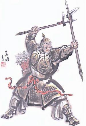 典韋(?---197),陳留己吾(今河南商丘市寧陵縣己吾城村)人,世稱“古之惡來(lái)”。在京劇中被畫(huà)為黃臉。三國(guó)時(shí)曹魏猛將。擅使大雙戟,為人壯猛任俠,曾為鄉(xiāng)人劉氏報(bào)仇,殺人出市,人莫敢近。軍中的牙門(mén)旗既長(zhǎng)且大,人們都不能把它舉起,而典韋竟以一手便將其執(zhí)而豎起,人們都以他的奇力為異。初屬?gòu)堝,后屬夏侯惇。曹操討呂布于濮?yáng)時(shí),典韋奮力勇戰(zhàn),為曹操所異,又因其人忠誠(chéng)謹(jǐn)重,自此引典韋為近侍,遷為都尉,置之于左右。后曹操于宛城時(shí),張繡先降而復(fù)反,急迫曹操本營(yíng);典韋守著大門(mén),殊死惡斗,殺敵甚眾,最終因敵人太多而戰(zhàn)死。在這一戰(zhàn)中,曹操的長(zhǎng)子和侄子也都戰(zhàn)死了。事后,在《三國(guó)演義》中,曹操親自祭奠,痛哭失聲。他對(duì)眾將領(lǐng)說(shuō):“吾折長(zhǎng)子、愛(ài)侄,俱無(wú)深痛;獨(dú)號(hào)泣典韋也!”。雖史實(shí)并未記載此事,但是完全可以說(shuō)明典韋在曹操心中的地位。