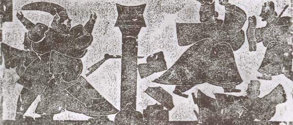 秦王政六年(前241),秦取衛(wèi)濮陽(今河南濮陽西南),作為秦東郡的治所,將衛(wèi)元君遷至野王(今河南泌陽),成為秦的附庸。荊軻于是到四方游歷,結(jié)識了許多豪杰志士。在榆次,他與蓋聶討論劍法,話不投機,蓋聶怒目而視,他就揚長而去。在邯鄲,他與魯句踐弈棋賭博,爭棋路,魯句踐對他加以呵斥,他仍是不予計較,悄然離去。隨后,荊軻來到燕國,與當?shù)氐墓吠婪蚝蜕瞄L擊筑的高漸離交上了朋友。荊軻喜好喝酒,整天與狗屠夫、高漸離一起在街市喝酒,然后,高漸離擊筑,他和著樂聲唱歌,唱著唱著就哭起來了。