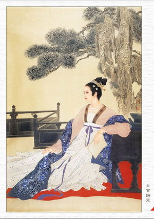 上官婉兒(664~710) 陜州陜縣(今屬河南三門(mén)峽)人,唐高宗時(shí)宰相上官儀孫女。麟德元年(664),上官儀因替高宗起草將廢武則天的詔書(shū),被武后所殺,剛剛出生的上官婉兒與母親鄭氏同被配沒(méi)掖廷。在掖廷為奴期間,在其母的精心培養(yǎng)下,上官婉兒熟讀詩(shī)書(shū),不僅能吟詩(shī)著文,而且明達(dá)吏事,聰敏異常。儀鳳二年(677),上官婉兒曾被武則天召見(jiàn)宮中,當(dāng)場(chǎng)命題,讓其依題著文。上官婉兒文不加點(diǎn),須臾而成,且文意通暢,詞藻華麗,語(yǔ)言優(yōu)美,真好像是夙構(gòu)而成。武則天看后大悅,當(dāng)即下令免其奴婢身分,讓其掌管宮中詔命。不久,上官婉兒又因違忤旨意,罪犯死刑,但武則天惜其文才而特予赦免,只是處以黥面而已。以后,上官婉兒遂精心伺奉,曲意迎合,更得武則天歡心。從圣歷元年(698)開(kāi)始,又讓其處理百司奏表,參決政務(wù),權(quán)勢(shì)日盛。