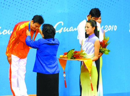 11月13日,22歲的山西小伙袁曉超在向觀眾抱拳致禮后邁步出拳,整個比賽歷時1分20秒,其動作一氣呵成,姿勢舒展,猶如行云流水,為中國代表團奪取本屆亞運會第一枚金牌。當時,站在他身旁為他托送金牌的漂亮姑娘來自河南焦作。