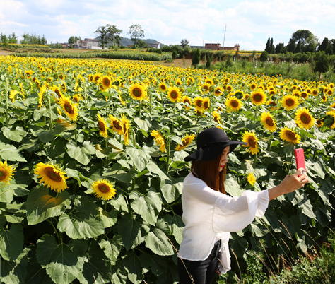 看,大片向日葵隨著陽光轉(zhuǎn)動笑臉,成了游客身后最美的風(fēng)景,向日葵花期能持續(xù)1個(gè)月左右。