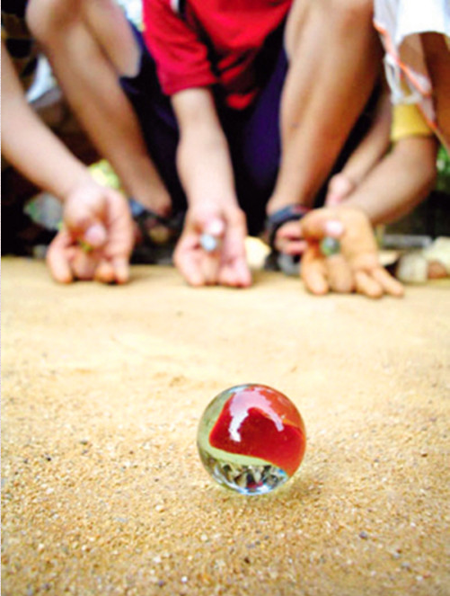 二是對(duì)“局”,此玩法最適合多人來玩。玩前,先找個(gè)地方畫一個(gè)“鍋”,一條橫線叫“杠”。開始前,每人各對(duì)彈子一個(gè),按一定距離橫排進(jìn)放“鍋”里,然后大家站到“鍋”前,向“杠”投擲彈子,叫“柄杠”,以母彈子離“杠”遠(yuǎn)近決定先后順序。第一名開始,要從“杠”上用手彈將母彈擊向“鍋”里的彈子,若能將其擊出“鍋”外,不僅擊出的彈子暫時(shí)歸己有,而且還可以連擊。若擊不中,暫停,俟第二名、第三名……直至本輪輪完后再依次擊。