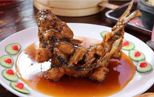 鮮活的黃河大鯉魚被師傅花樣改刀,前后翻滾入至油鍋,一瞬間就被炸至金黃,再在秘制好的醬汁里翻滾拌勻,最后蓋上面絲,魚肉中夾雜著醬汁的甜味和面食的淳樸, 這道菜,真中!