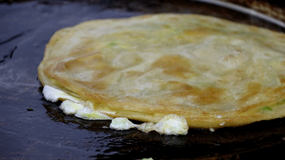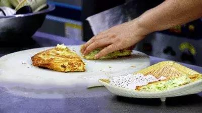 當(dāng)“滋滋”聲響起時,雞蛋灌餅就可以出鍋了。