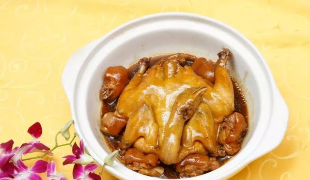 這道菜叫“花雕神仙雞”,是孫羊正店的主打菜品之一,往來賓客必點佳肴。做法簡單,遵循大道至簡的規(guī)律,將整只雞從中切開直接腌制,把豬蹄放入雞內(nèi),加入醬汁,使兩者充分融合。