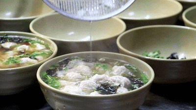 選用新鮮食材,現(xiàn)調(diào)現(xiàn)包,把餡的精華緊緊鎖在餛燉皮里,在沸水中快速滾熟,倒入已經(jīng)配好的鮮湯中,一碗鄭記餛燉就這樣出鍋了!